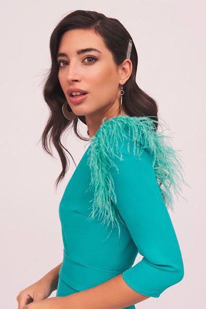 Las plumas en los hombros aportan un detalle exclusivo y de tendencia, perfecto para invitadas que buscan un look diferente sin renunciar a la elegancia. Confeccionado en crepé de alta calidad, este vestido garantiza una textura ligera y estructurada, adaptándose perfectamente al cuerpo.