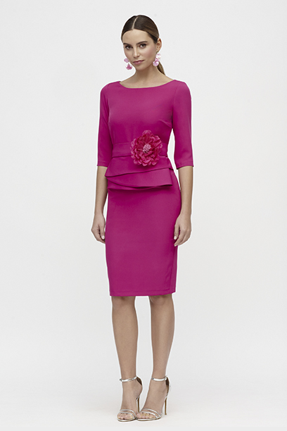 Su escote barco aporta un aire de distinción y elegancia clásica, mientras que las mangas francesas ofrecen la combinación perfecta entre formalidad y frescura. La cintura con detalle floral en relieve se convierte en el punto focal del diseño, realzando la figura con un toque femenino y sutil. El diseño de la falda recta permite estilizar la silueta, aportando una imagen equilibrada y sofisticada.